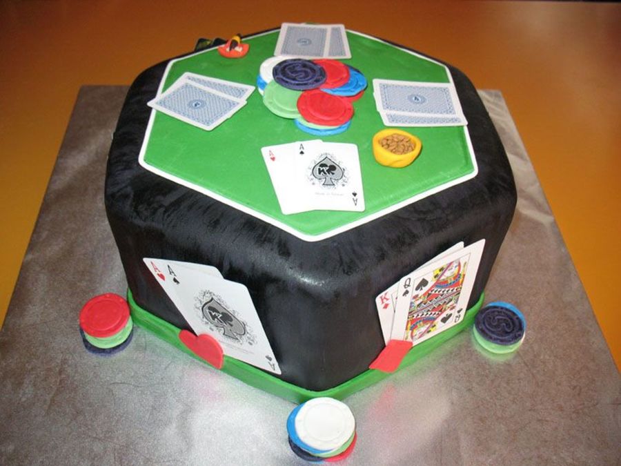 This was for a diaper shower for a group of men. 10 inch hexagon cake. The cards were real playing cards...all else was fondant.