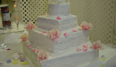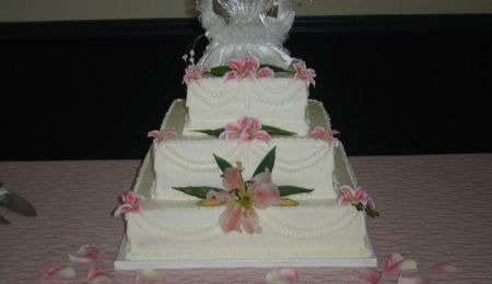 10 inch iced in buttercream with ribbon around bottom and silk roses. with buttercream scrolls.