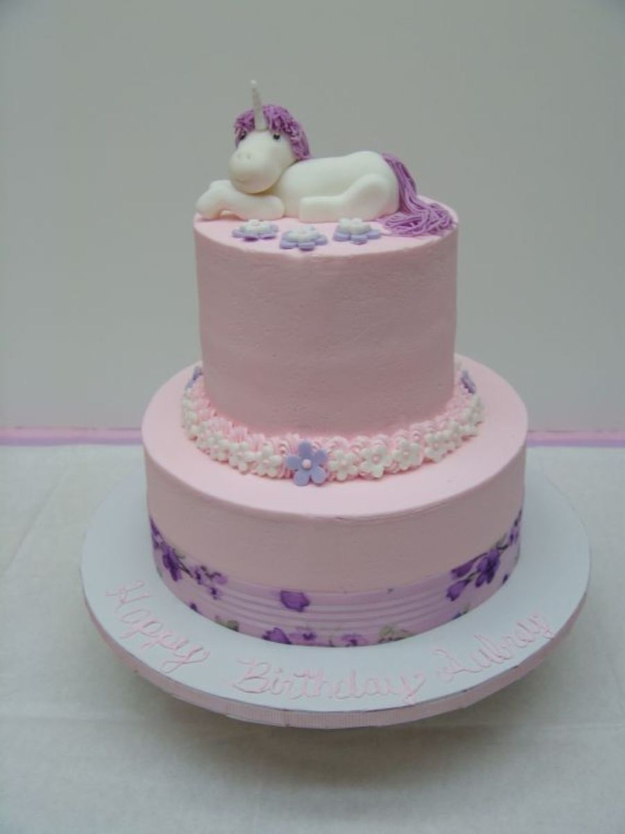 I made this cake for my daughter's 5th birthday. I was inspired by a cake on Flickr.com. Bottom is 10" round and top is 6" round. Iced in buttercream with fondant flowers and fondant/gumpaste (50/50) sclupted unicorn. I was going to put a big "5" on the side of the top tier, but ran out of time.