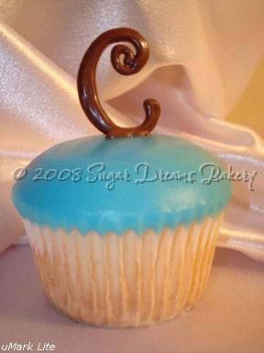 This was one of two dozen monogram cupcakes for a baby shower! WASC cake with poured fondant and chocolate monograms! Pretty easy to make, and I was told by my customer that everyone loved them!