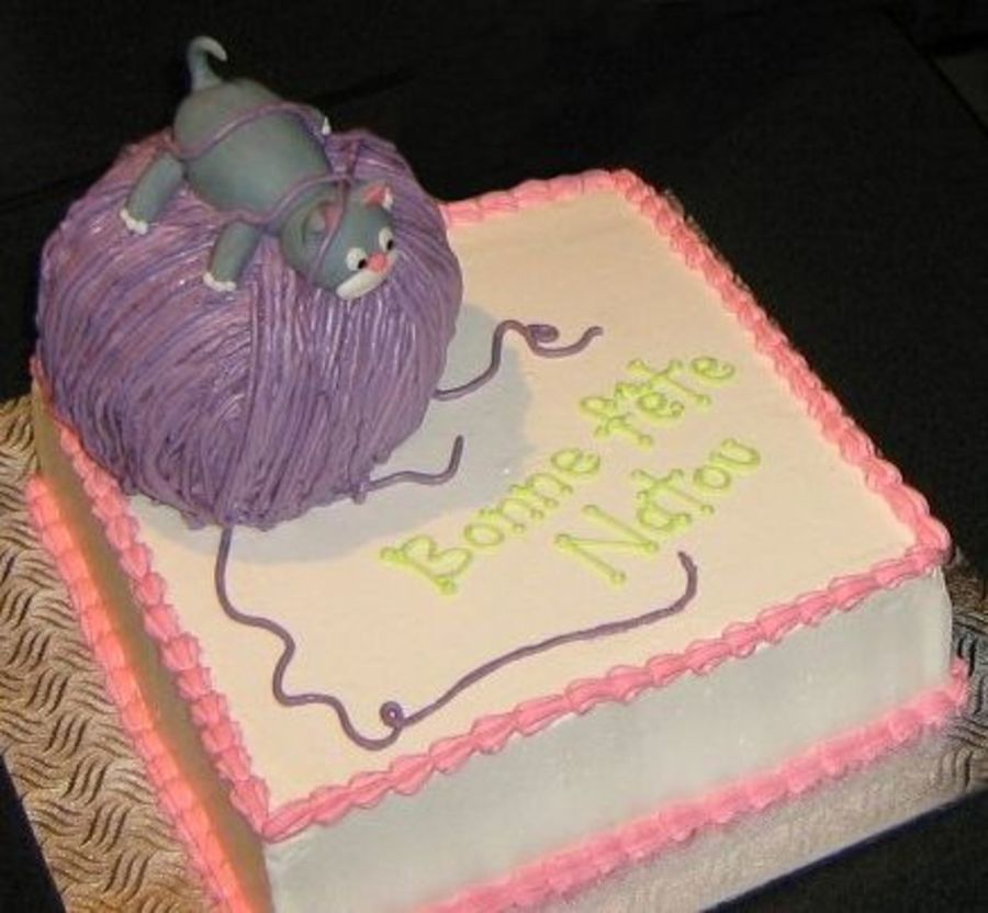 Inspired by Debbie Brown's design. Cat is in fondant, the rest (including the wool) is BC. The ball is cake. It was sculpted.