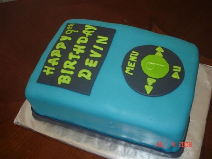 My son asked for an Ipod cake that was blue and green. It is a marble white/chocolate fudge cake with Oreo cream cheese filling. All fondant decor with colorflow lettering.