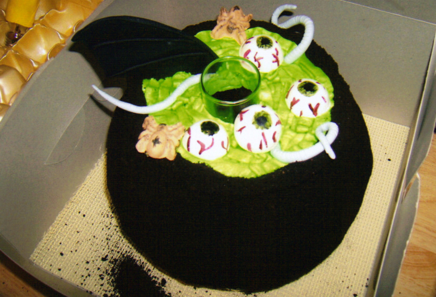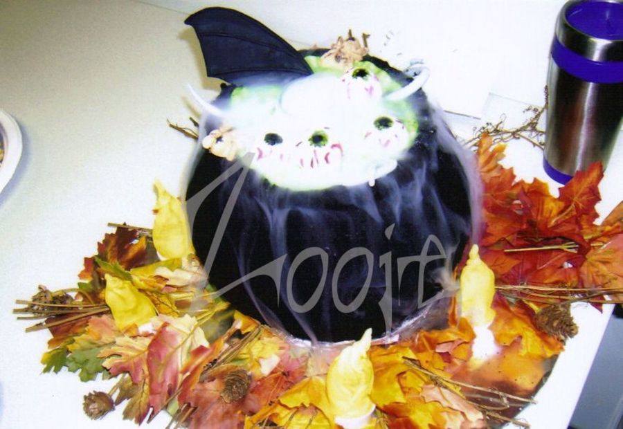 I wanted to do a cauldron cake for a work party where there was "smoke" coming out of the cake. Used some bundt pans, a thin vase in the middle, gum paste spiders, rat tails, bat wing, and eye balls, and threw in a bit of dry ice. ;) (cauldron "covering" was crushed Oreos sans filling)