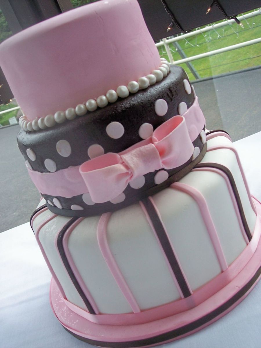 Inspired by franjmc's beautiful cake. Was so excited when the bride said her colors were pink & brown! 10", 8", 6" rounds covered in all Satin Ice fondant. 8" is in dark chocolate Satin Ice. Pink is Wilton Pink. Bow is fondant with Tylose mixed in with Super Pearl - Pearl dust. Pearls are fondant covered in Super Pearl - Pearl Dust. Cake board covered in pink fondant and trimmed with ribbon. Was a fun cake to make! Got a little rained on while unloading from my car, but overall turned out well!