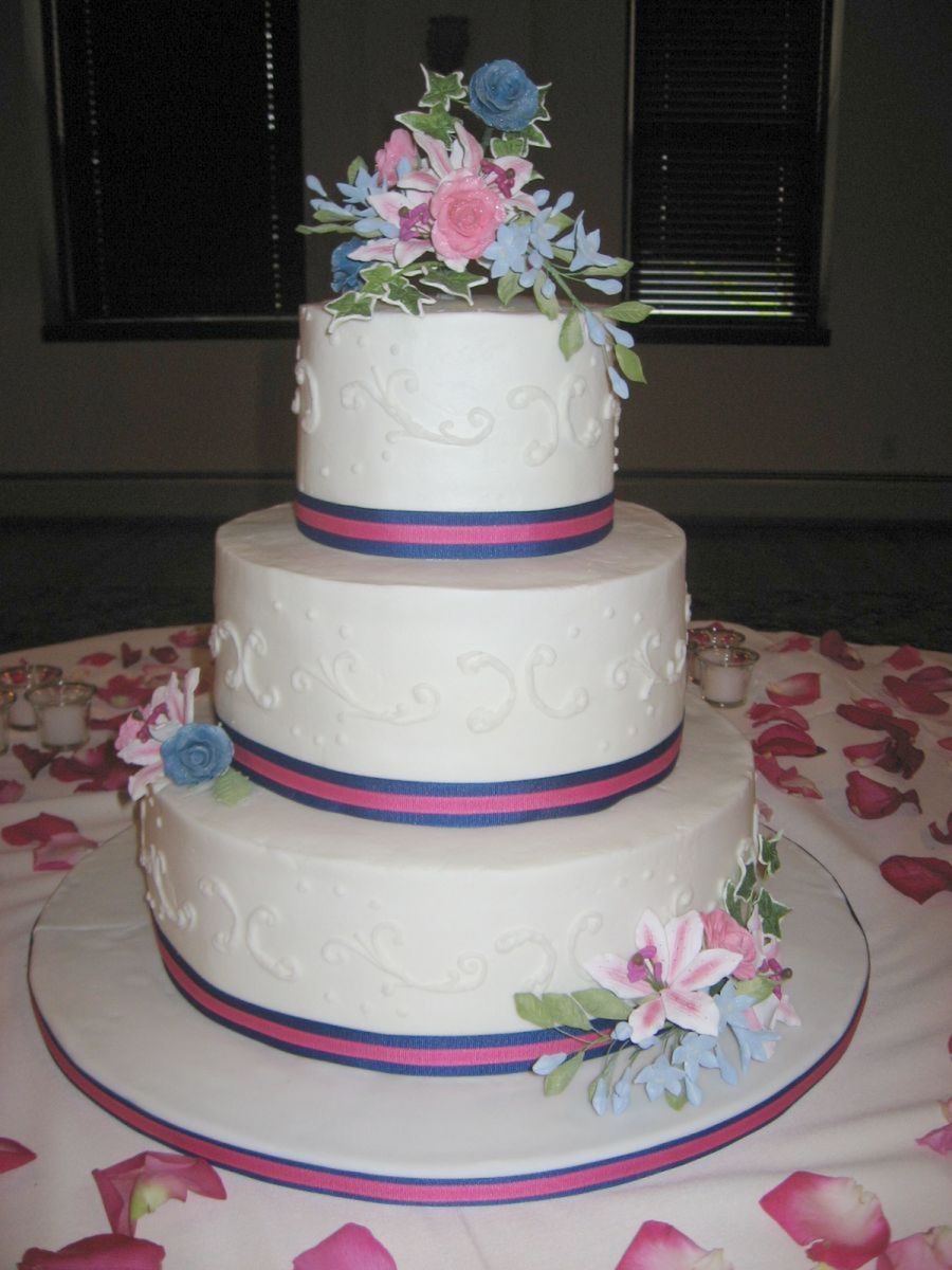 BC iced wedding cake with gumpaste flowers and fondant covered board.