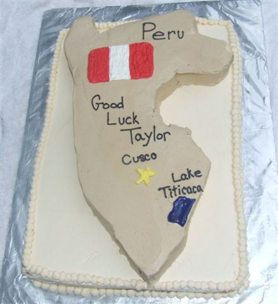 My DH's neice is traveling to Peru for a month. My SIL asked me to make a cake shaped like Peru. Vanilla cake covered in BC. Thanks for looking.