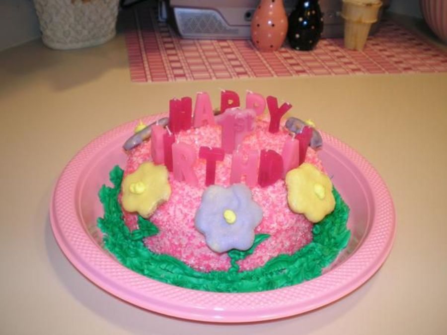 Mini-Cake for my daughter's 1st, Garden Themed, Birthday party. Pink Butter Cream frosting covered in pink sugar crystals with sugar cookie flowers.