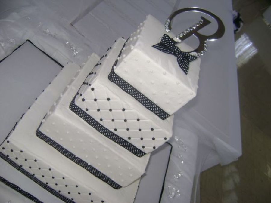This was the quilted look done with impression matt with black dots on BC, Every other layer was just white pearls. Mirror Monogram , the ribbon was black and white dotted cotten , with a mini bow on top. TFL