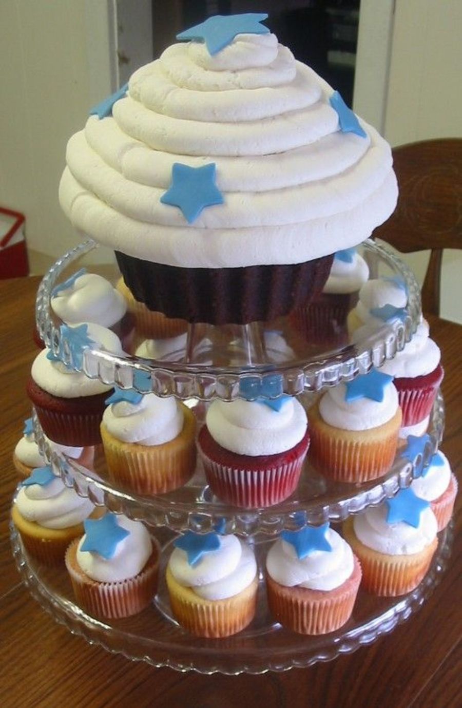 All scratch: red velvet, yellow & strawberry cupcakes; vanilla bc; vanilla fondant; 1/2 yellow & 1/2 chocolate giant cupcake! TFL!