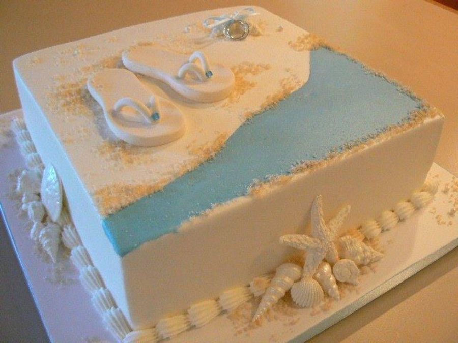 10" yellow cake filled and iced with buttercream. Bride asked for replica of flip flops worn at wedding..... and rings tied with ribbon on top of cake. Flip flops made from gumpaste/fondant. White chocolate seashells dusted with super pearl dust. Edible pearls. Cute couple!! Fun cake!