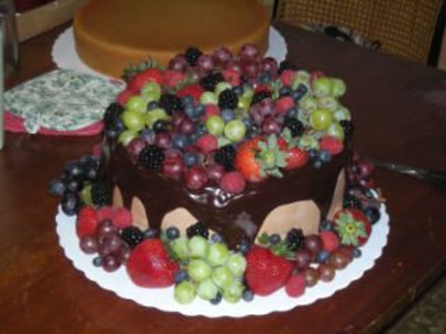 My first groom's cake! It is chocolate cake with chocolate bc. I topped it with ganache, then all the fruit.