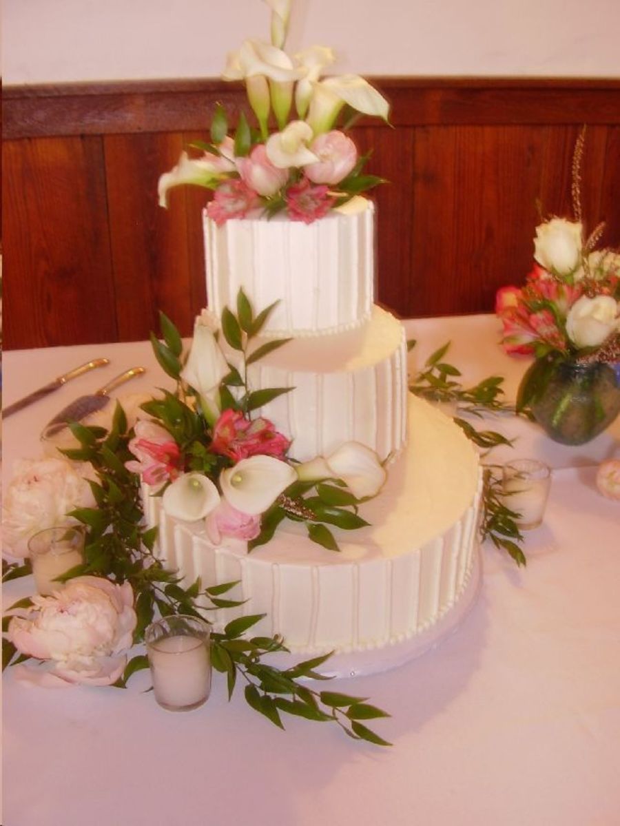 2 tier oval cakes w/ 6" round. Bottom tier is carrot cake, middle tier is white cake w/raspberry filling, top tier is italian cream. Cake really comes to life w/addition of fresh flowers. Frosted in BC.