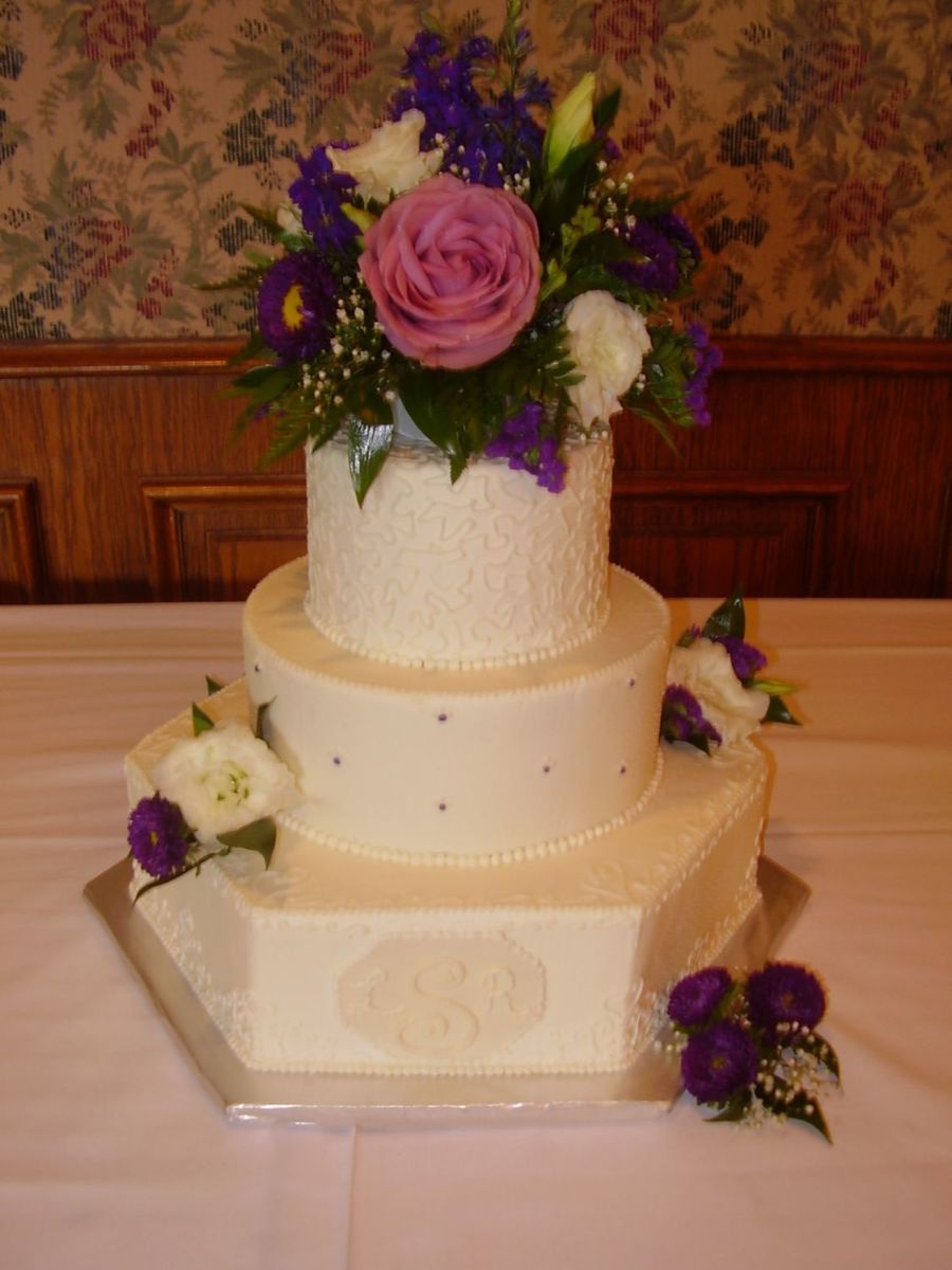 Made this cake for my daughters friend. Bottom tier choc. w/ cookies n cream filling, middle tier white cake w/ pineapple filling, top tier white cake w/ fresh strawberry filling. Couples initials added to bottom tier, fresh flowers for topper as well as smaller bouquets.