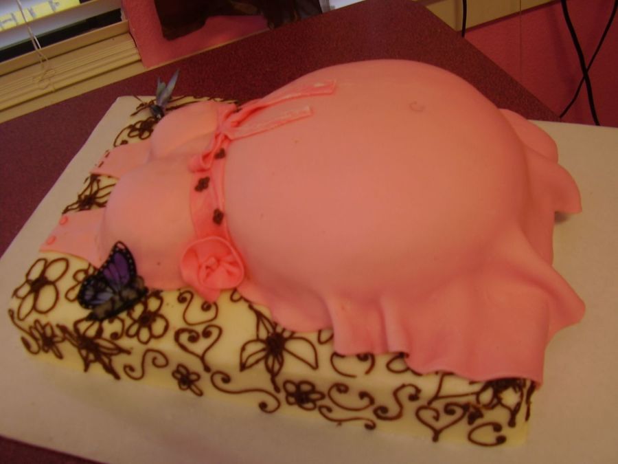 Made this belly cake for my son's girlfriends sister. Got inspiration from here. Thanks to all! Belly is choc. cake and bottom layer is white cake. Choc. piped flowers over entire bottom cake. Had some trouble making dress pattern. Butterflies are store bought. I have a feeling I will be making more of these cakes once customers see how different they are from your typical grocery store cakes.