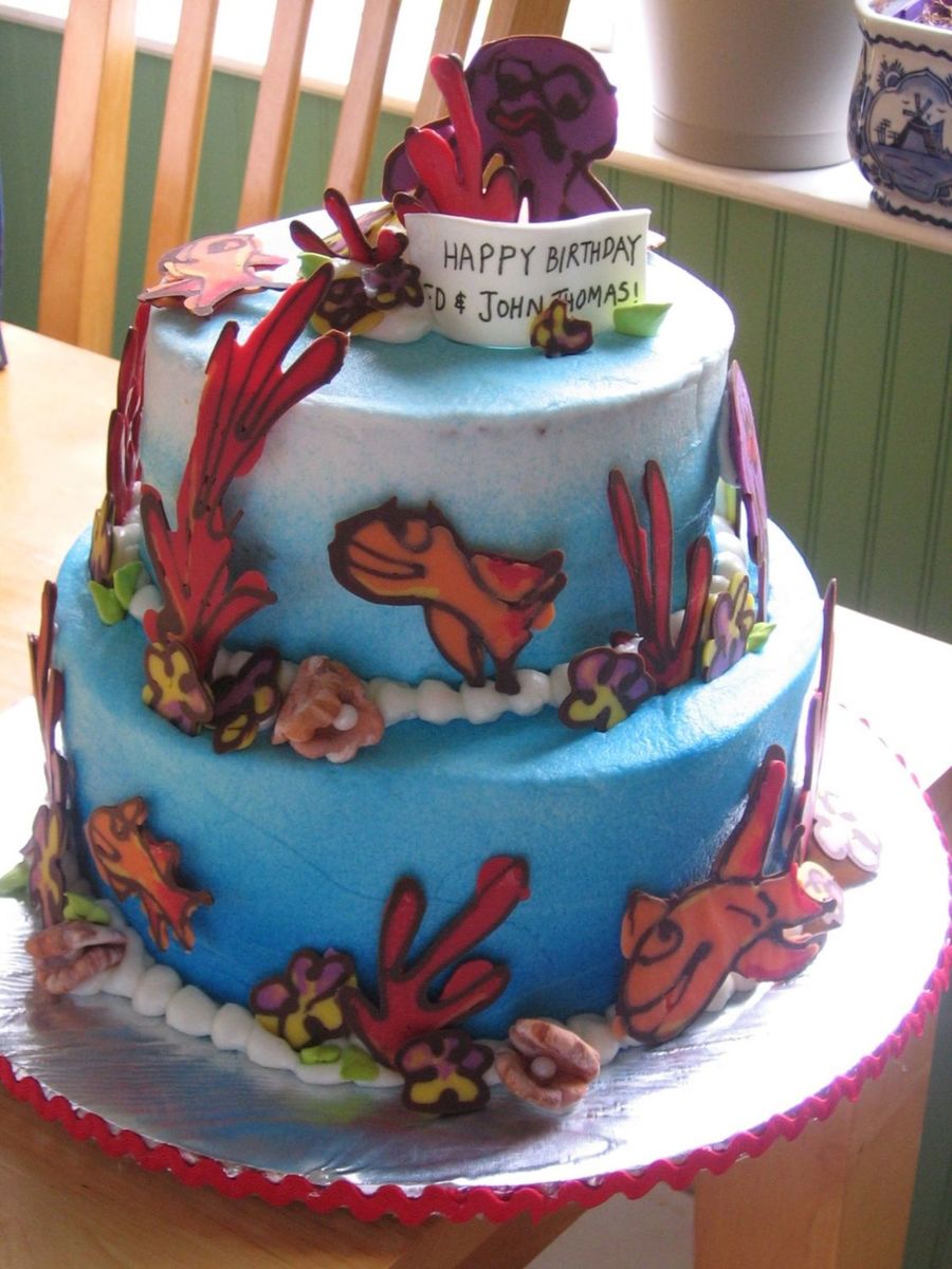 This cake was done in buttercream with white chocolate decorations, inspired by the Whimsical Bakehouse. The seashells are gumpaste with edible pearls and a few royal icing leaves. Thanks for viewing!