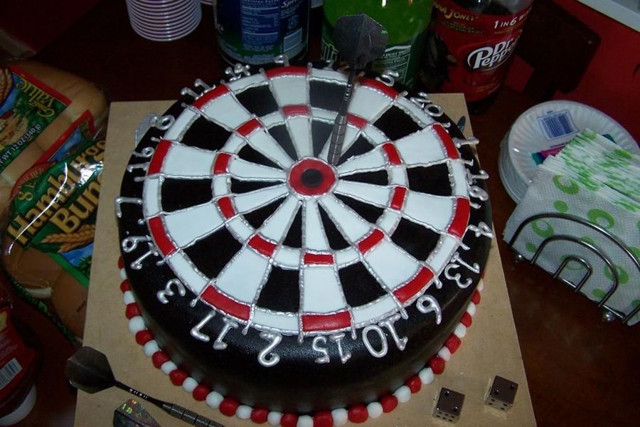 A copy of Steponmi's fabulous Dartboard Cake. French vanilla cake filed and frosted with vanilla bean butter cream. Covered in chocolate fondant, dyed black. All decorations in MMF. The horrid piping job was done in silver RI.