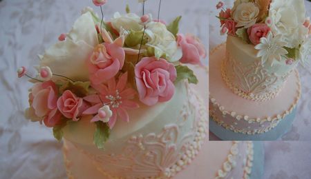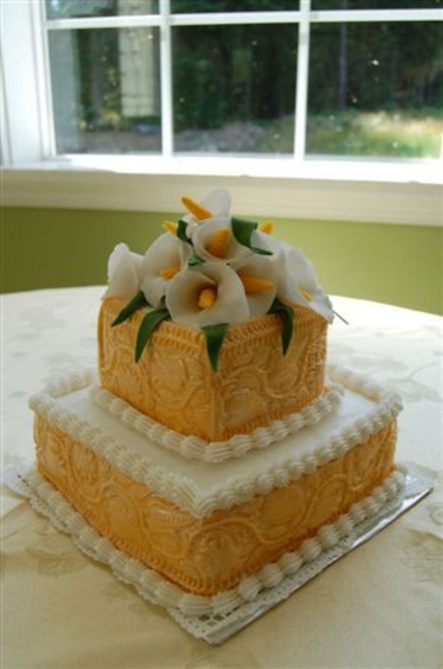 This cake is my mothers banana cake recipe with mango, pineapple, filliing that I made from a freezer jam recipe that I created myself. Frosted in buttercram and then a fondant border with fondant calalilies. I wanted to practice a few different things so I decide to make this cake as a practice cake, I tried a new buttercream recipe that I got off of CC and the roller I got to make the fondant border. Thanks for looking.