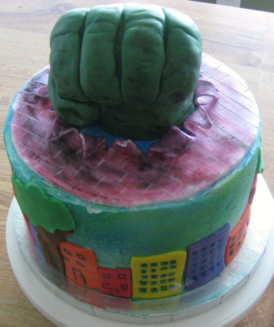 We molded Hulk hand from rice treats, covered in fondant, wanted to get a more cartoon type finish so we did the buildings all around the cake. The birthday boy LOVED it!