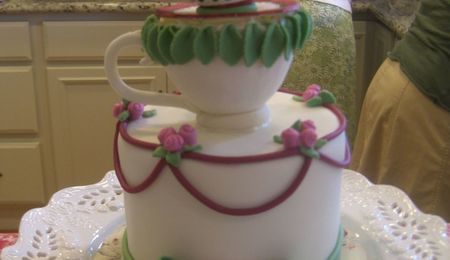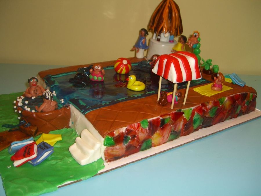 I made this with my niece and we had a lot of fun doing this. Each person at the party is represented on the cake. My crazy 3 year old son is doing the cannonball jump into the pool in upper right. We COMPLETELY copy-cat-ed the pool cake by "rania."(THANKS!) We made the water out of melted sugar and the rest is MMF.