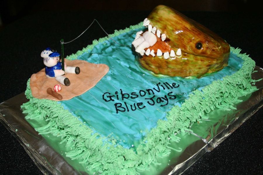 My 9 year old son wanted this cake for his end of season baseball party. Their coach is taking them fishing on his pond and he wanted a fish eating one of the players. He helped make the players. We used buttercream and MMF.