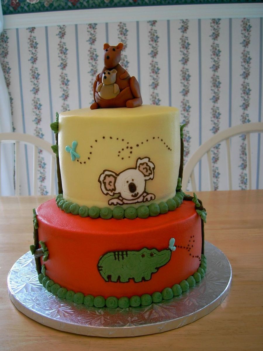 This is a 9" Chocolate and 6" White for a baby shower. The cake was made to match the mother to be's nursery bedding she picked out. - Down Under by Mantex. Kangaroo Mama and Baby are fondant, with everything else buttercream.