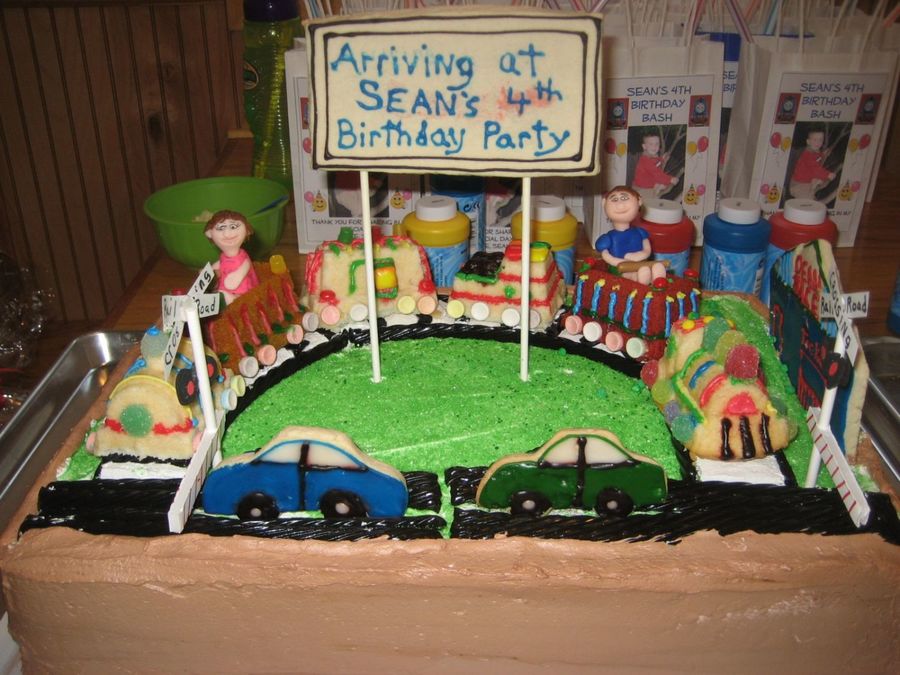 Grandson's 4th birthday cake Yellow sheet cake with half oreo cookie and van choc chip pudding filling. Top is snickrdoddle 3-d train set . Bettercream frosting and candy.