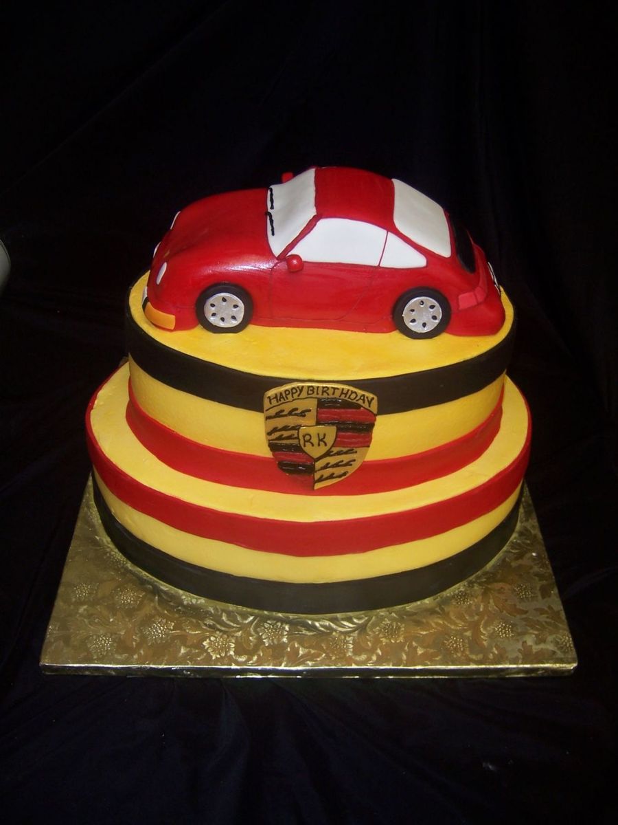 Buttercream icing on the yellow tiers with fondant accents. Car carved adn from cake and covered with fondant