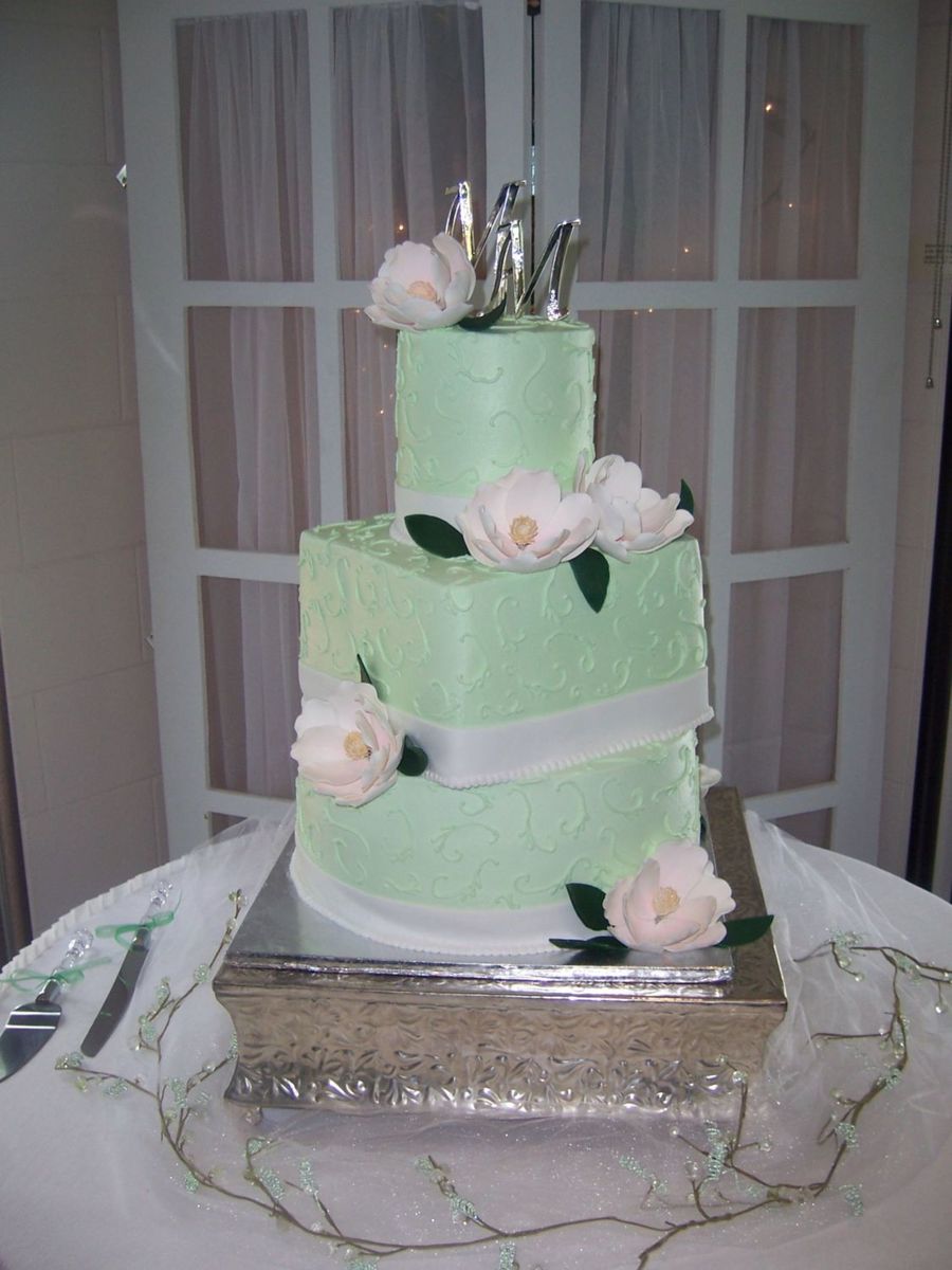 I like this cake even though the middle tier came out too large. All butercream with gumpaste magnolias.