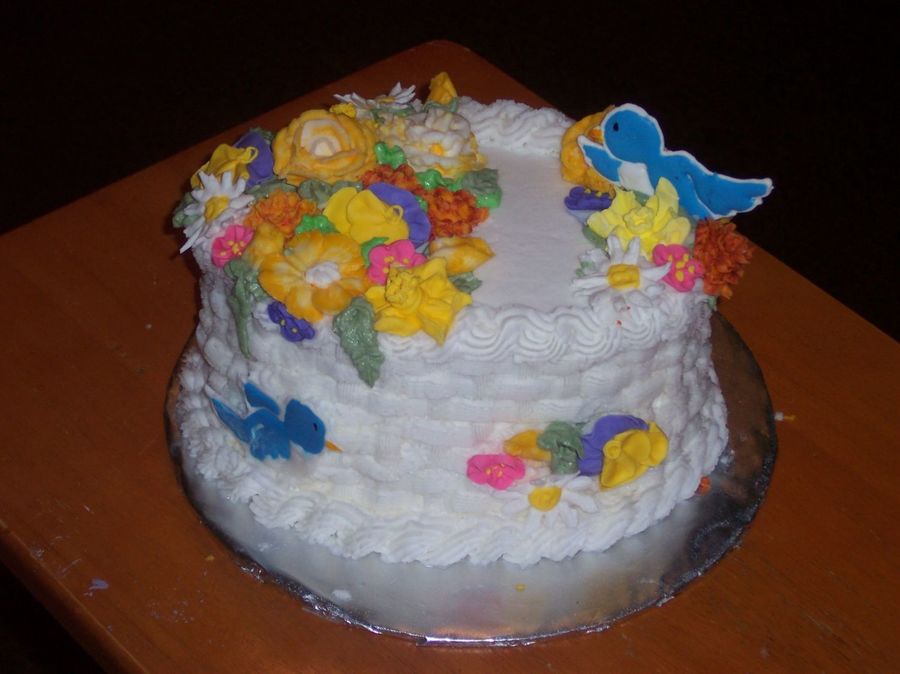 Devils food cake with chocolate cheesecake filing. White buttercream icing with royal icing flowers and color flow for blue birds.