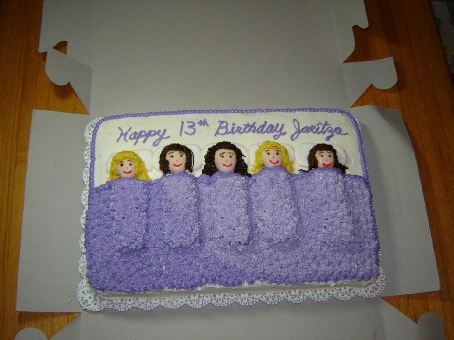 12x18 chocolate cake, made smaller loaf shape cakes for the girl's bodies. Faces out of fondant, painted with food coloring, pillows/fondant.