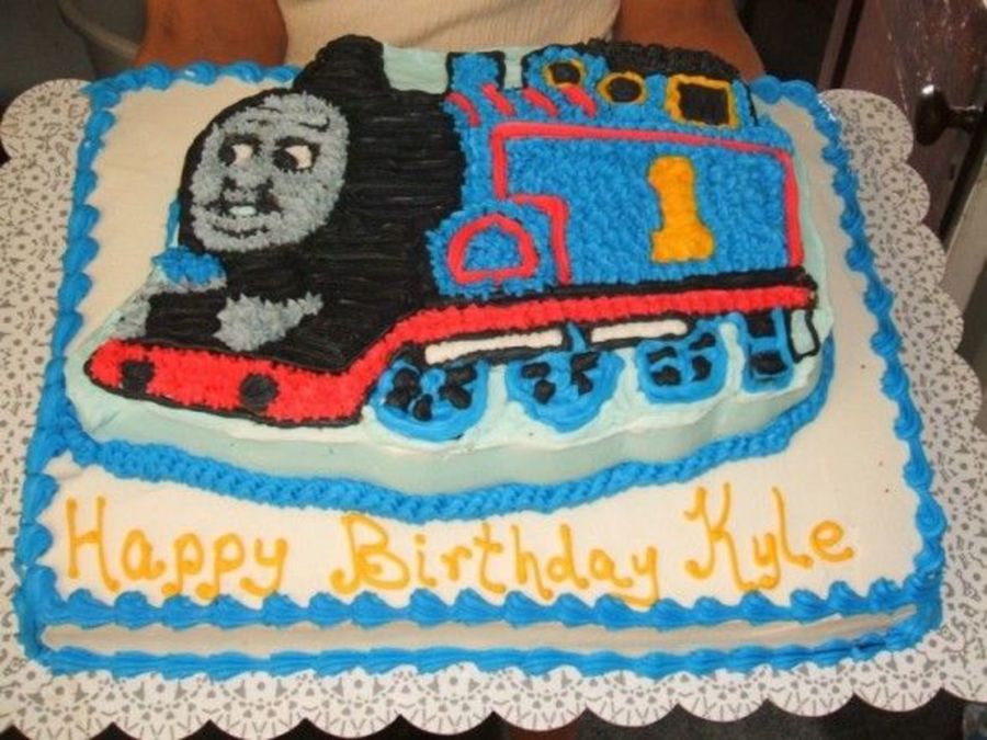 A thomas cake (wilton Pan) on top of a half sheet cake. All vanilla with bc icing. made for for cousins sons birthday. i dont really dont like to make the character pans, but that is what she wanted