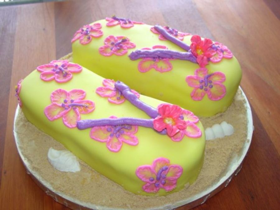YEllow fondant with brush embrodiery flowers on a board covered with crushed vanilla wafers for sand with fondant shells. Royal icing flowers on the center.