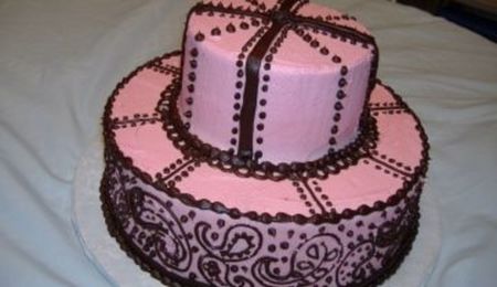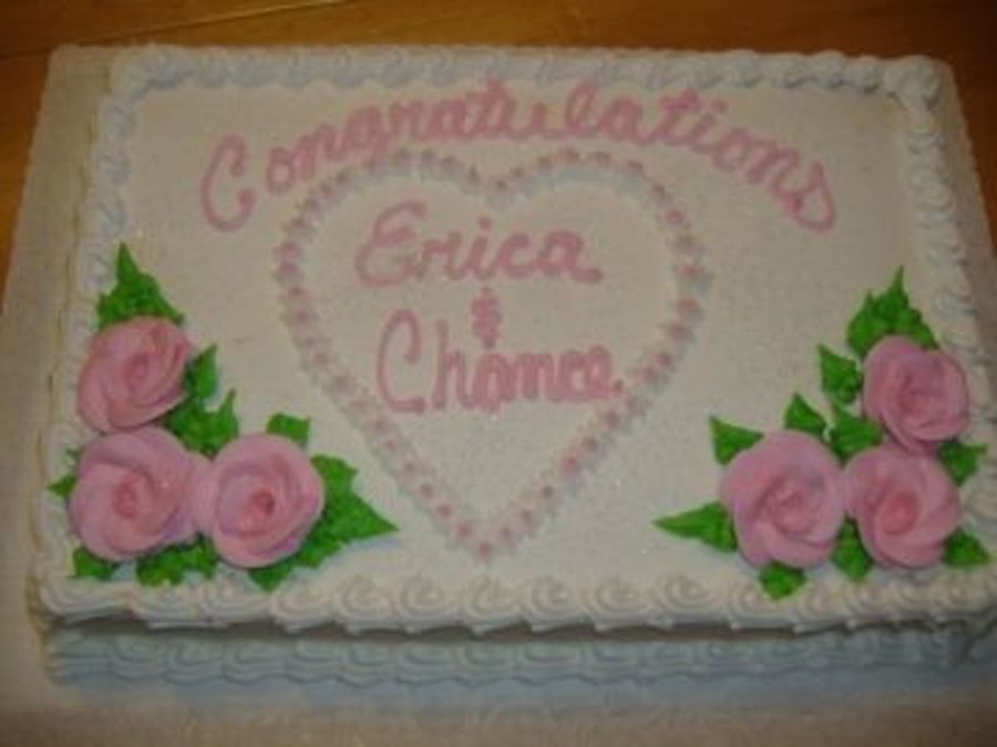 9 x 13 white sheet cake , iced in buttercream with buttercream roses in the corners . i outlined the heart with a star tip and added the names.