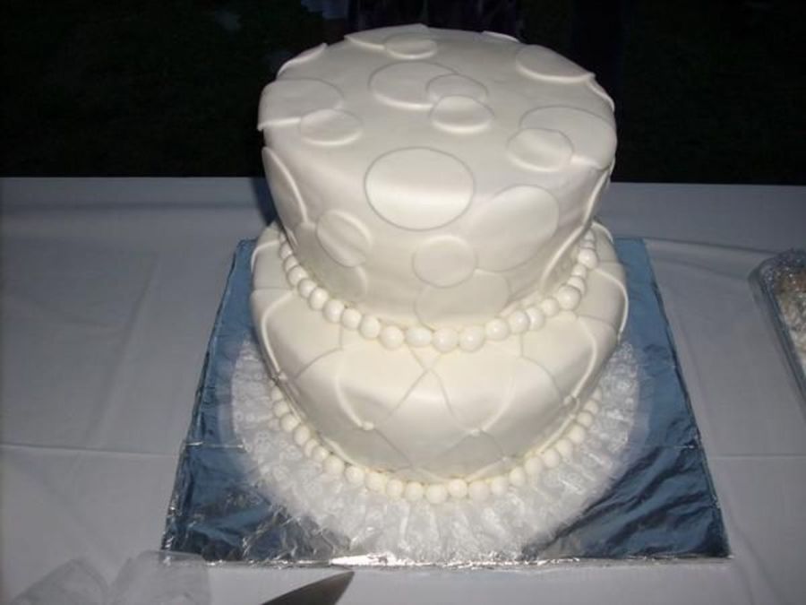 unique cake. the side were tapered in at bottom. The top decorated with circles and bottom with the diamond pattern. All fondant