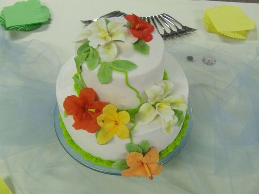 gumpaste hibiscus & orchids on white cake w/white bc