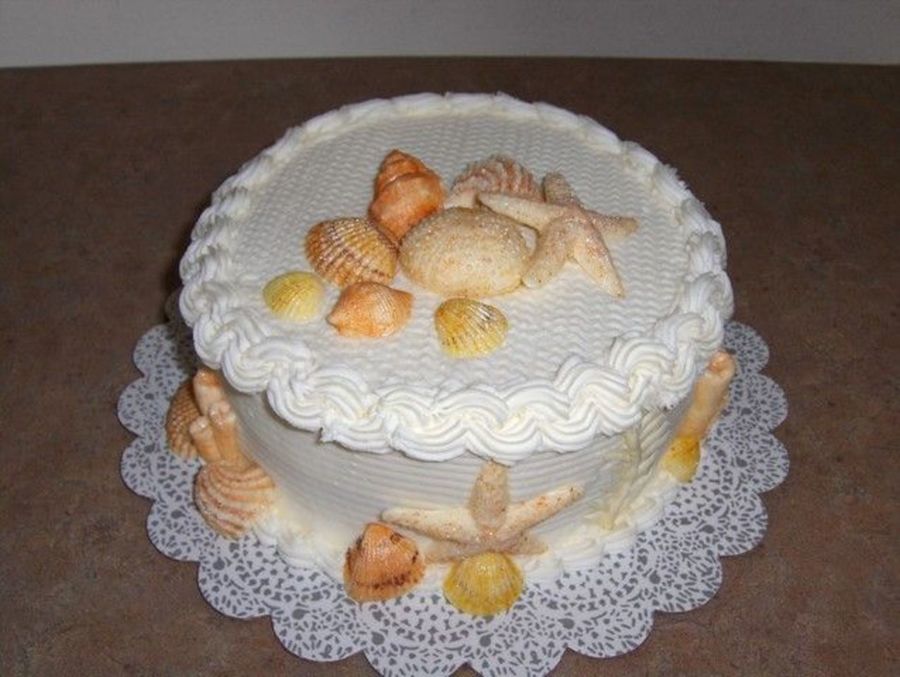 This cake was for my husband's birthday. As he requested- strawberry cake with strawberry mousse filling and creamy vanilla icing. Shells are white chocolate. Thanks for looking.