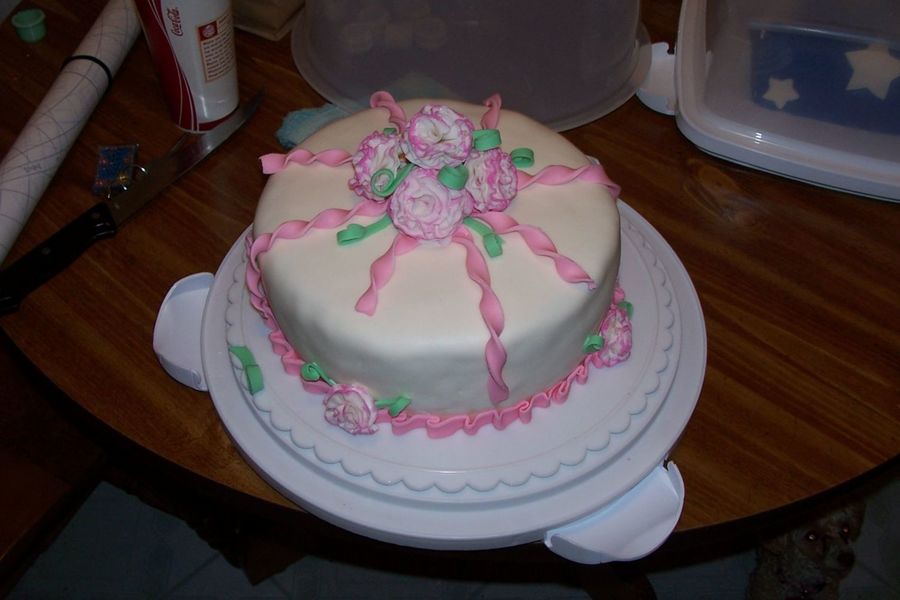 I was just practicing this was one of my first cakes. M&M fondant strawbery cake with vanilla whip icing