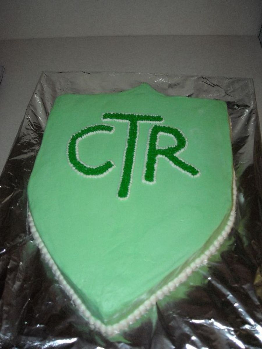this was my friend's little boy's baptism cake. ctr stands for "choose the right" it is carved from a 11x14 pan and decorated in all buttercream.