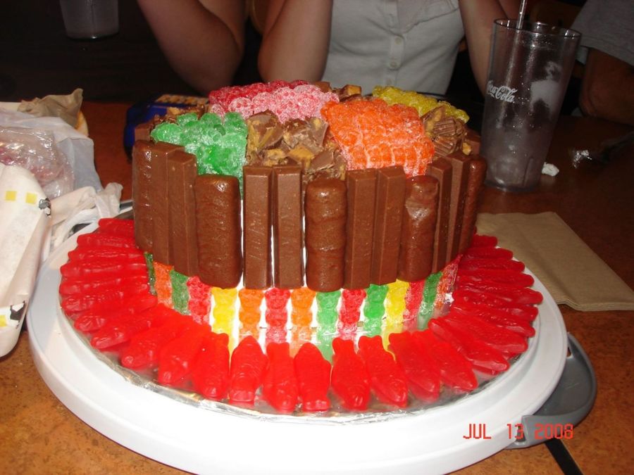 This was for my DD Bday. It was Sourpatch Kids, Twix, Kit Kats, Peanut Butter Cups, and Swedish Fish. She loved it!!! Inspired by bonjovibabe's Candy Cake.