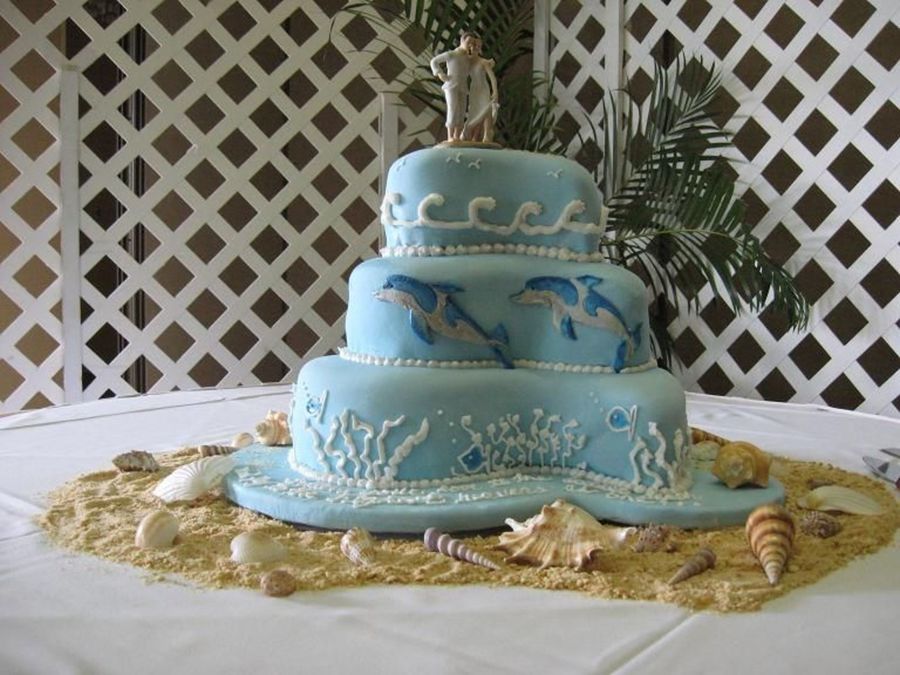 Paisley cake pans. White cake with passion fruit filling covered in fondant. Dolphins are fondant and all other decorations buttercream. Sand is made from crushed vanilla wafers.