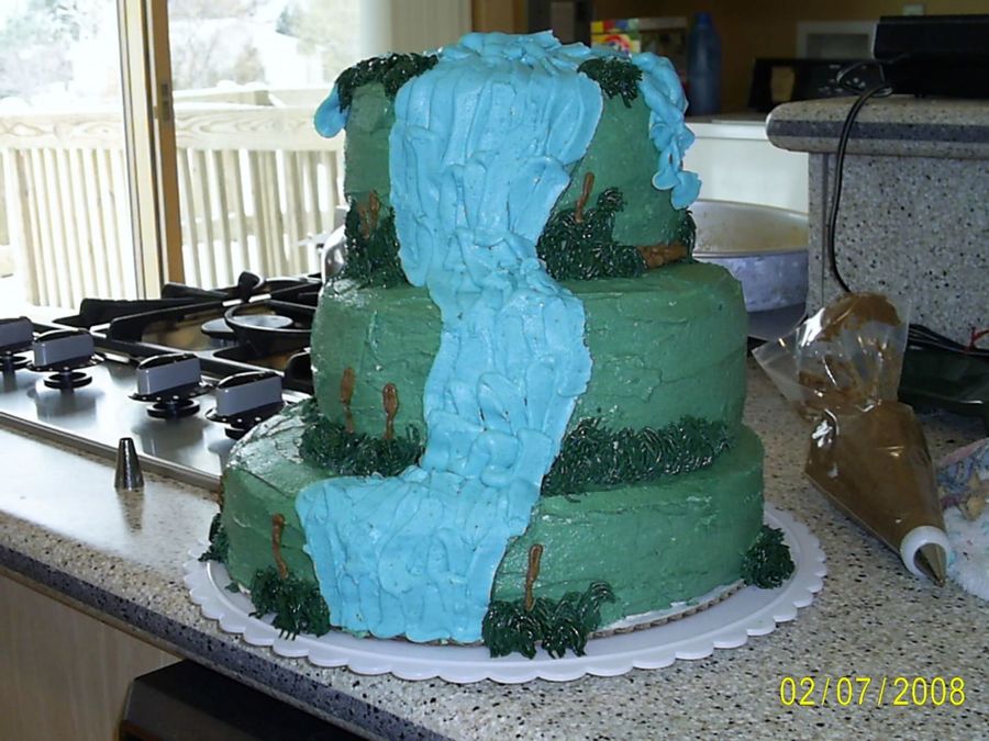 this i cake i did for my boss. he loves nature stuff everything is buttercream. and has 3 waterfalls all around the ckae and includes cat tails and long grasses
