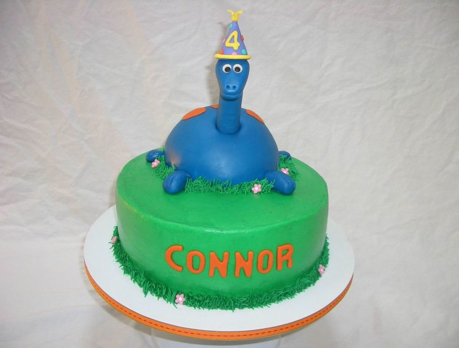 Dinosaur cake for my co-workers sons 4th birthday. The dinosaur body is cake and he is covered in fondant. He is all edible except for the plastic support for his neck. The cake is iced in buttercream. I left room in the front for a candle.