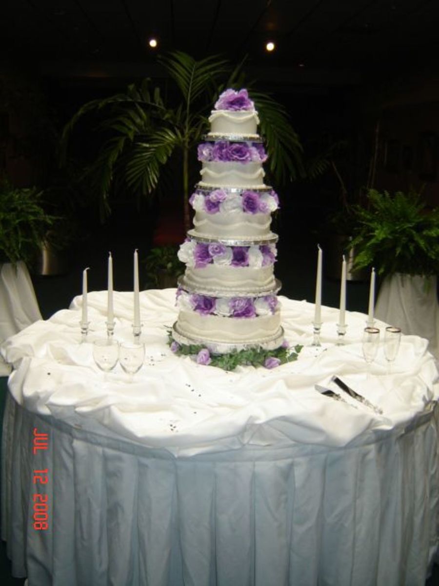 This is my tallest cake to date. Its a 14, 12, 10 (dummy), 8, and 6. All buttercream with artifical flowers (alot of them). I used regular separator plates and hidden pillars to support the cake. It turned out great, I now say that I have mastered the swags!!!! It was a little difficult because the bride wanted the swag at different heights, so i made the 2nd and 3rd tier swag in the same location, and the 4th adn 5th tier swag in the same location, with the topper different as well. Thanks for lookin
