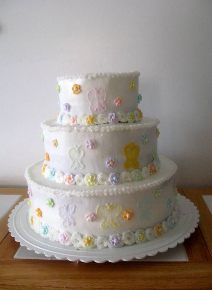 This was on request from the bride. She had wanted "daisies" with all different pastel colors and butterflies somehow... then she drew me a picture of the idea of her "daisies" and it was just a made up flower with rounded petal edges... nothing like an actual daisy. So even though I think this looks more like a baby shower cake, I followed her instructions and this was the final product. They have a topper that will be added before the reception tomorrow.