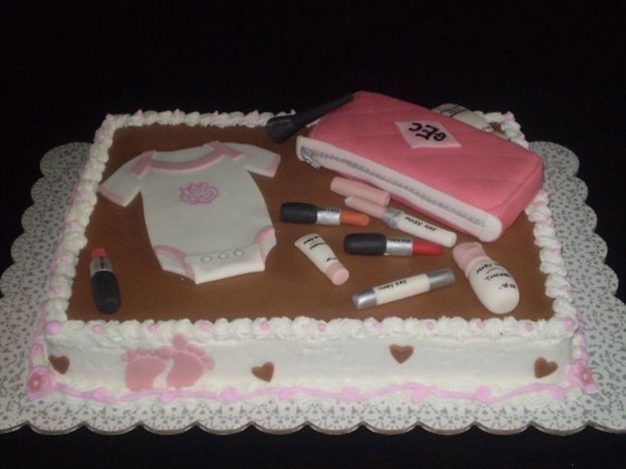 Ok, this was a little hard, the mommy to be is a Mary Kay Consultant and wanted the products incorporated on the cake and this is what I came up with. Butter cake with fondant accents, and the little purse is a small loaf pan cake with fondant and the letters on it is the baby's initials. Also the onesie has the Mary Kay logo on it hand painted. They were so HAPPY with it, and I am so relieved, please tell me what U think, TFL
