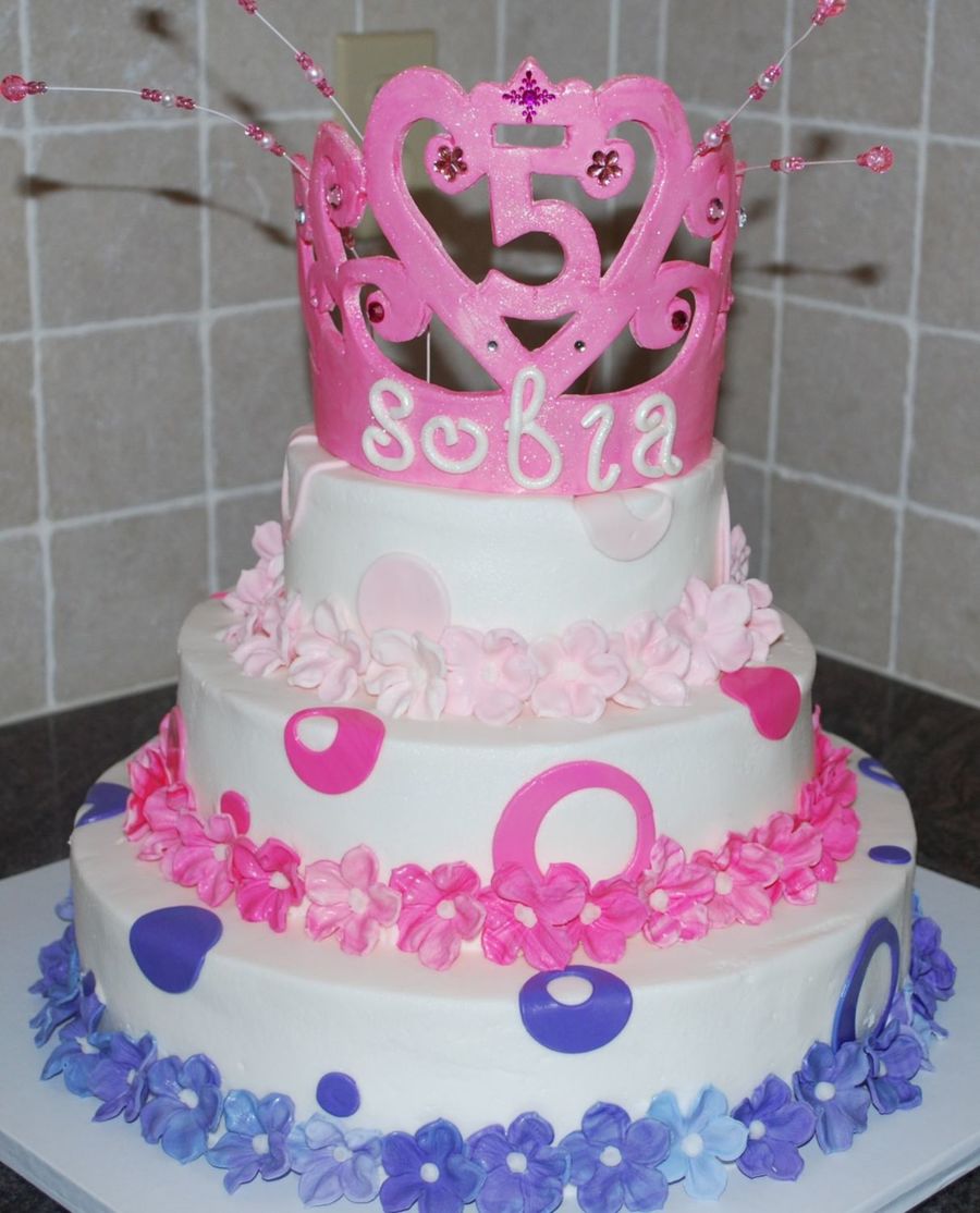 Chocolate chip cake filled with strawberries & BC. Frosting is BC with fondant accents. Crown is gumpaste.