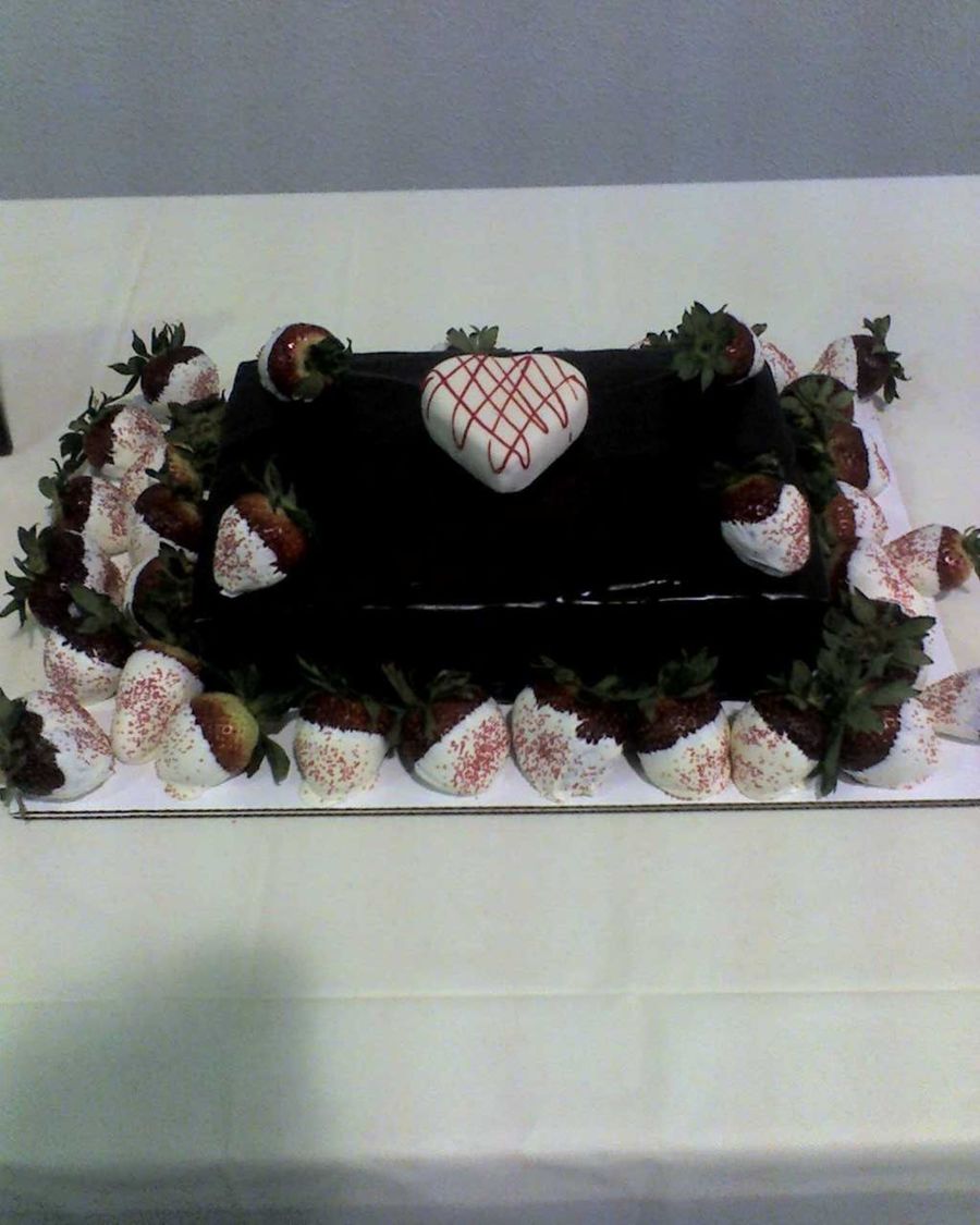 Chocolate fudge cake, chocolate ganche, white chocolate dipped strawberries
