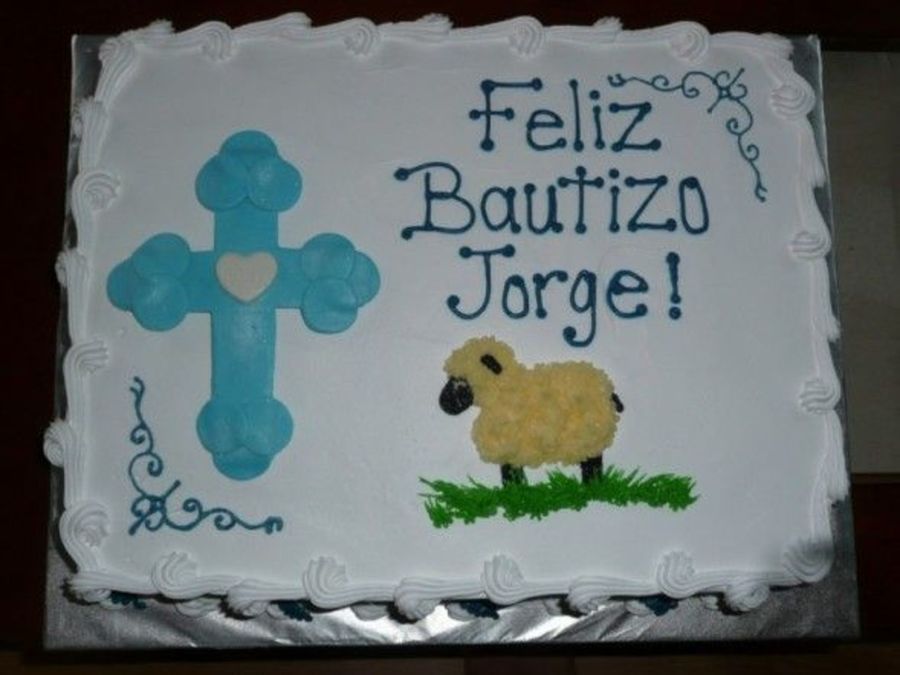 Cake is choclate with a custard filling, covered in whipped cream with mmf cross, and buttercream lamb.