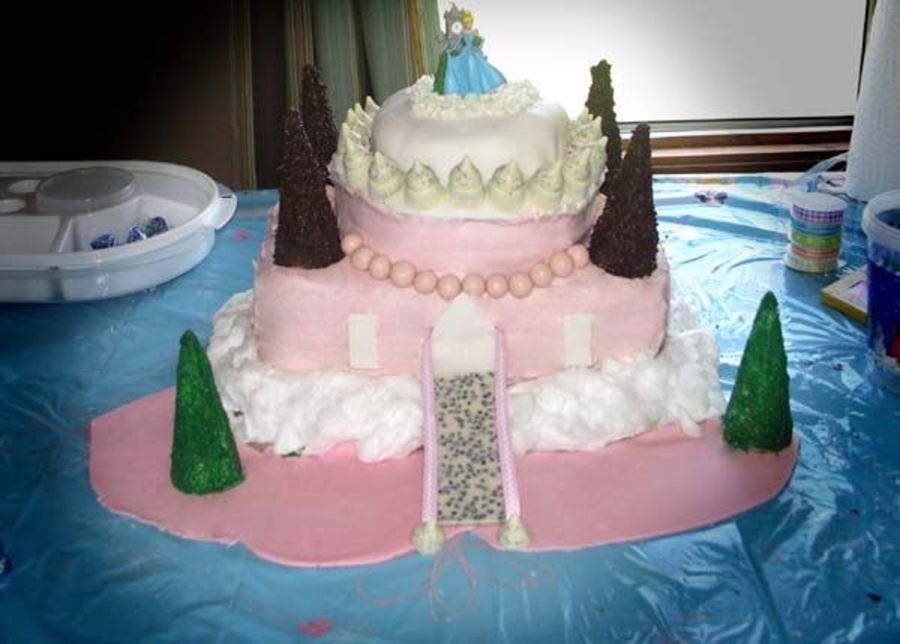 A friend and I worked on this one for her daughter's third birthday. The theme was princess and I think we did good with the time we had to assemble this before the party. My favorite part was the white cotton candy clouds..but we discovered you have to wait to just before everyone sees it to put it on or it will shrink down to nothing..oops. It was a GREAT learning cake.