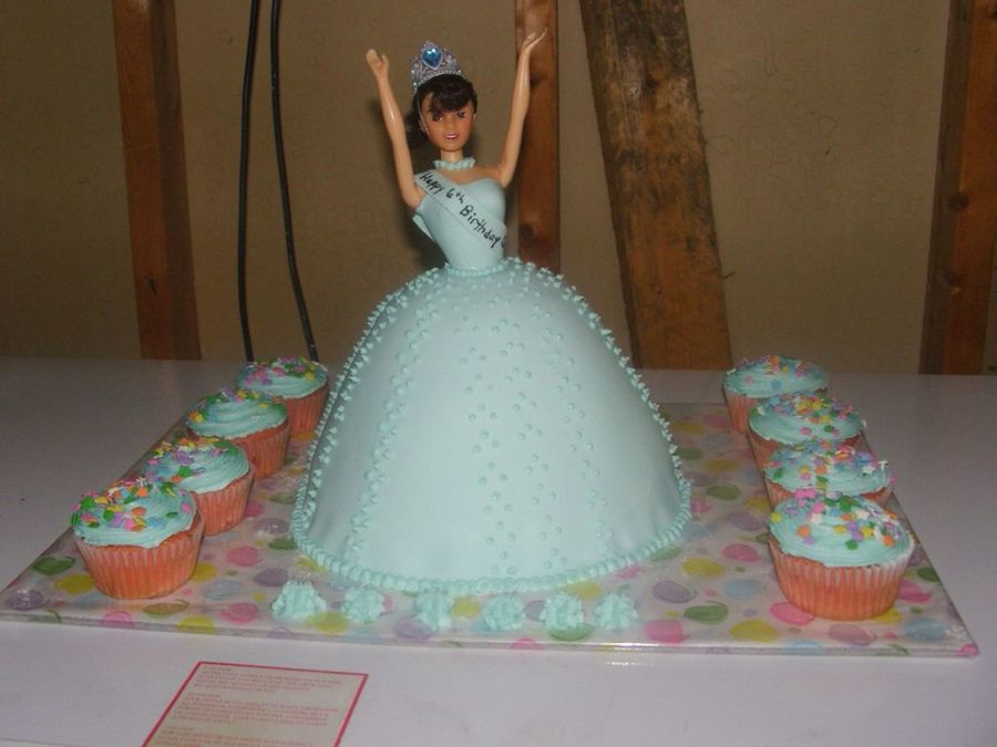 A cake I made for my daughters 6th birthday.Strawberry cake with white chocolate pudding filling and iced with fondant. Matching cupcakes.